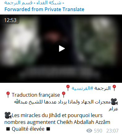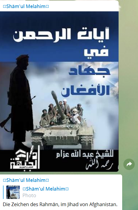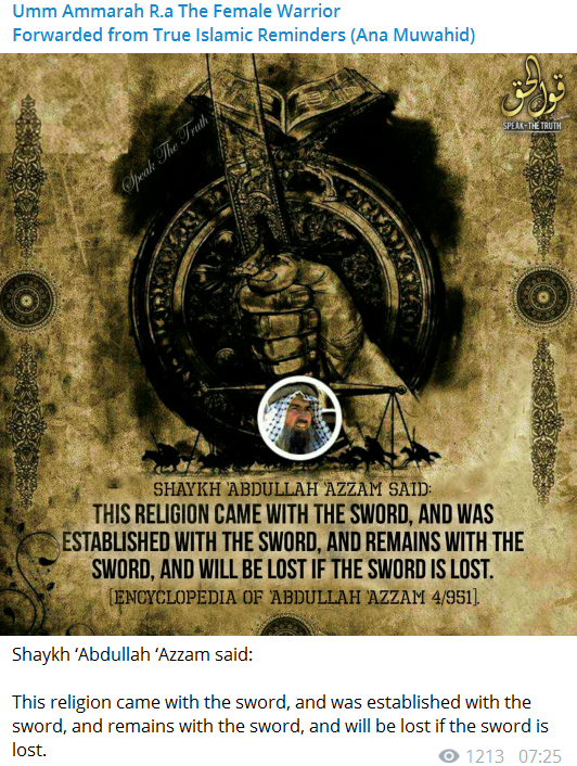 11. For example, in late August 2018 the channels Sham’ul Melahim, Livet i Sham, shabakat al-fida’, Umm Ammara, and Mujahidah all posted Azzam materials, such as his book Signs of the Merciful (in both Arabic and English) and videotaped lectures (with English and French subtitles), in addition to memes featuring his picture and selected quotes.