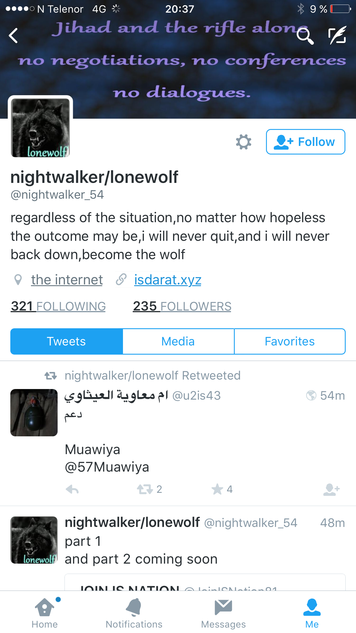 36. In September 2015 the user of the Twitter account @nightwalker_54 included in his biography a link to the IS media repository Isdarat while at the same time having a background picture with an Azzam quote (“Jihad and the Rifle Alone,” in English) (accessed 20 September 2015).